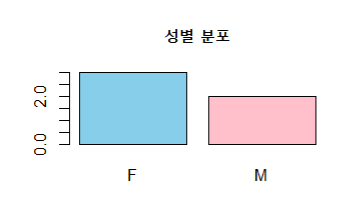 barplot(table(x), main="성별 분포", col=c("skyblue", "pink"))