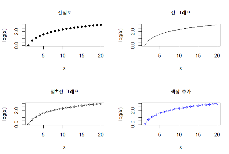 plot(x, log(x), type="o", main="점+선 그래프")
